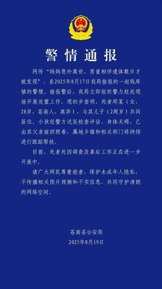 网传“妈妈意外离世,男童相伴遗体数日才被发现”,系2025年8月17日该局接报的一起钱库镇的警情。接报警后,该局立即组织警力赶赴现场开展处置工作。现初步查明,死者郑某(女,28岁,苍南人,离异),与其儿子(2周岁)共同居住。小孩经警方送医检查评估,身体无碍,已由其父亲接回照看,属地乡镇和相关部门将持续进行跟踪帮扶。