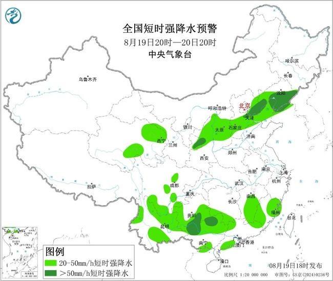 中央气象台8月19日18时继续发布暴雨黄色预警:预计,8月19日20时至20日20时,京津冀、陕西北部、山西中北部、辽宁中南部、吉林东南部、青海东部、四川盆地西部、贵州南部、广西中北部、云南北部和东南部等地的部分地区有大到暴雨,其中,辽宁南部和东部、河北中部和东北部、北京东南部、天津中北部等地局地大暴雨(100~180毫米)。上述部分地区伴有短时强降水(最大小时降雨量30~60毫米,局地可超过80毫米),局地有雷暴大风等强对流天气。