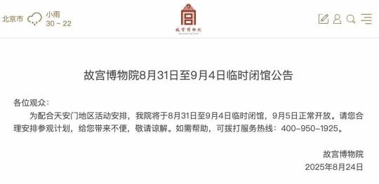 为配合天安门地区活动安排,故宫博物院将于8月31日至9月4日临时闭馆,9月5日正常开放。请您合理安排参观计划,给您带来不便,敬请谅解。如需帮助,可拨打服务热线:400-950-1925。