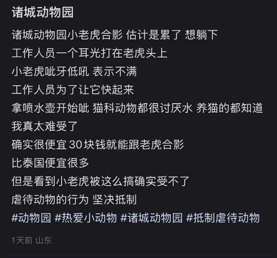 发帖网友在帖子中表示,和小老虎拍照的价格为30元/次,“确实很便宜,30块钱就能和老虎合影,但是看到小老虎被这么搞确实受不了。”该帖引发网友热议,众网友纷纷表示,“真的看不下去,坚决抵制虐待动物的行为。”