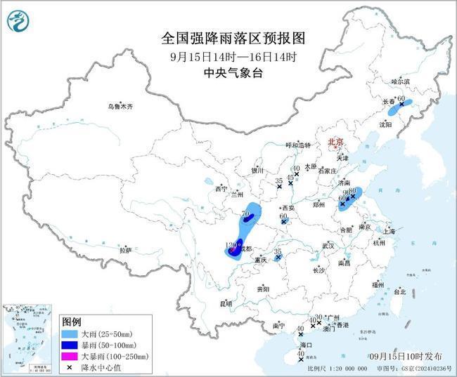 预计,9月15日14时至16日14时,甘肃南部、四川盆地西部以及山东南部、河南东部、安徽北部、江苏北部等地部分地区有大到暴雨,其中,四川盆地西部等地部分地区有大暴雨(100至120毫米)。