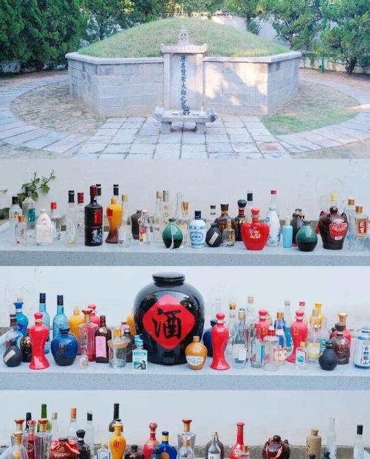 鲜花、美酒和写给古人的信件,成了最常见的供品。以李白为例,大家都知道他爱饮酒,常在长安酒肆与同好对饮,醉酒而归。所以在他的墓碑前,白酒、红酒、啤酒、清酒一应俱全,连年轻人偏爱的果酒也被摆上。从酒的小样(迷你酒)到大酒坛子,琳琅满目,颇有要办“酒类博览会”的架势。