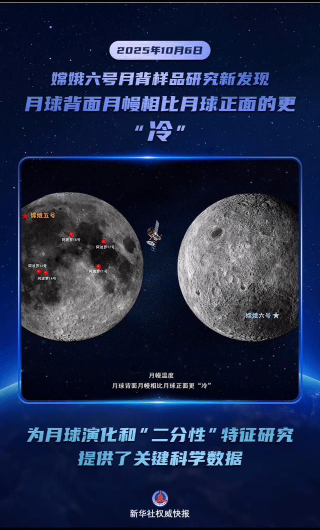 10月6日,在中华民族传统佳节中秋节之际,国家航天局和国家原子能机构联合发布嫦娥六号月球背面样品研究最新成果。中国科学家首次基于嫦娥六号月球背面样品研究发现,月球背面月幔相比月球正面更“冷”,这一发现进一步深化了人类对月球“二分性”现象的认识,为月球正面与月球背面的月幔温度差异提供了岩石学与地球化学等科学依据,为月球演化和“二分性”特征研究提供了关键科学数据。