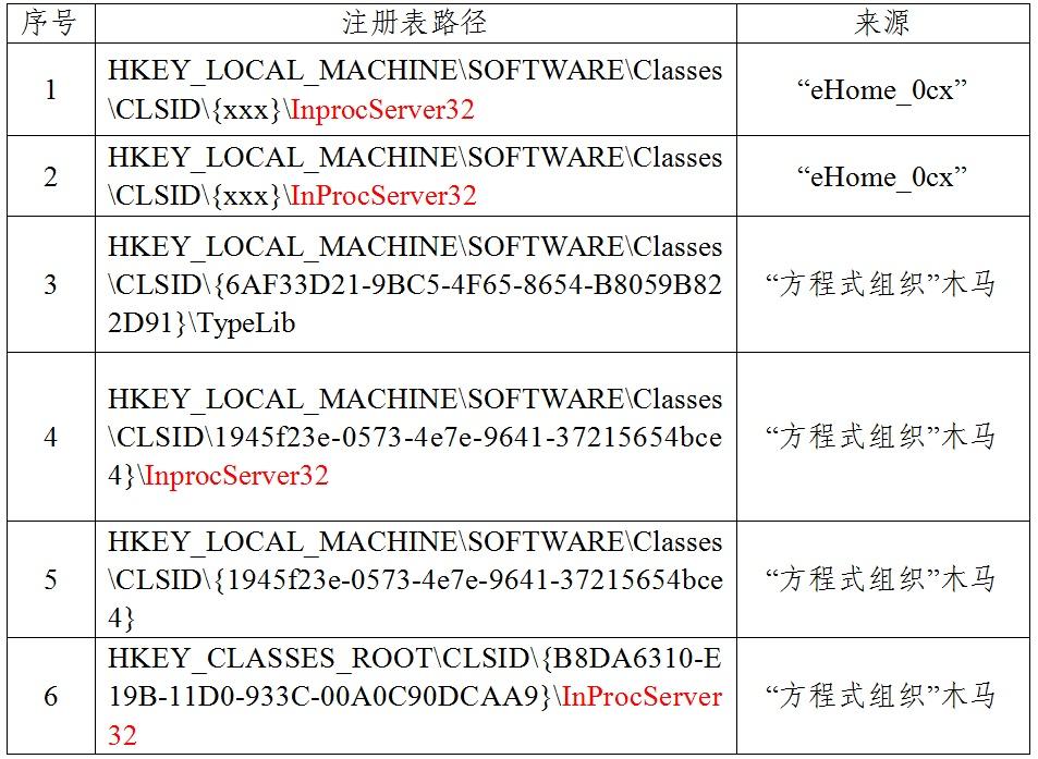“eHome_0cx”的部分驻留文件通过修改注册表InprocServer32键值的方式,劫持了系统正常服务,在系统正常程序启动前加载实现自启动。注册表修改位置与NSA“方程式组织”所使用网攻武器相同,均位于HKEY_LOCAL_MACHINE\SOFTWARE\Classes\CLSID下随机ID项的InProcServer32子项。