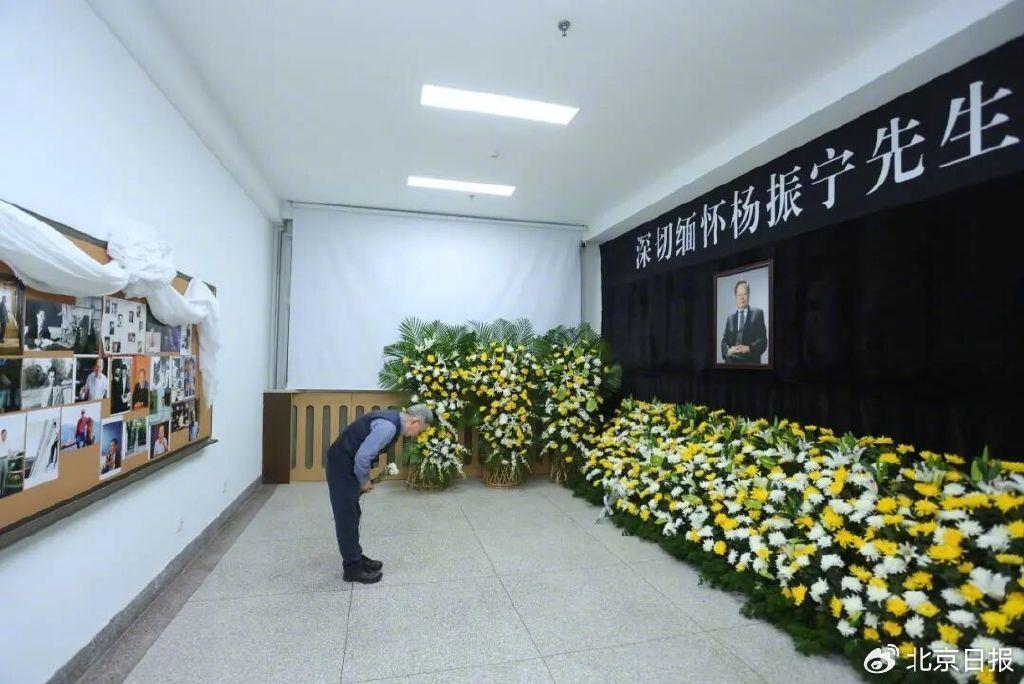 朴素无华的缅怀室里,黄白色菊花几乎铺满了整个房间。墙上正中的黑色相框里,杨振宁先生面带微笑,目光仍如往昔般睿智,注视着前方。