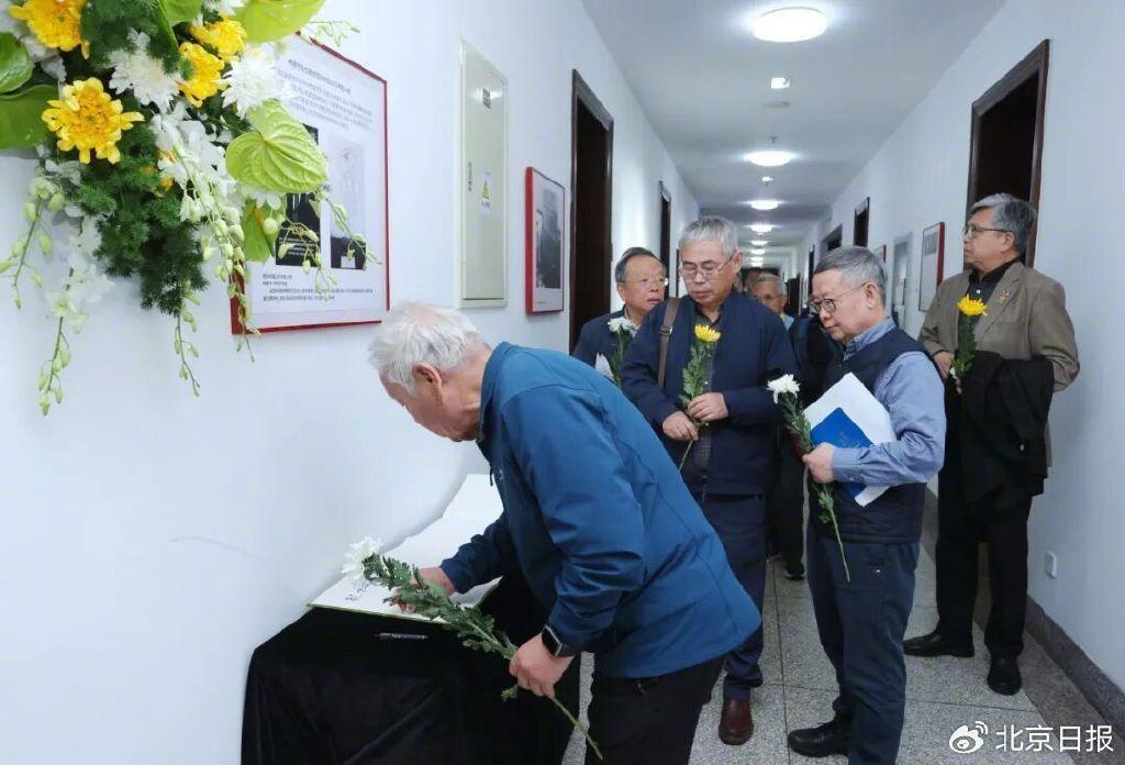 秋风轻拂过缅怀室入口。侧墙上,一张张照片静静悬挂,串联起杨先生跨越一个世纪的生命轨迹。人们放缓脚步,每人从桌上拿起一枝菊花,准备献给先生。花瓣上沁着的凉意,似是凝住的哀思。墙边桌上,两本厚重的签名簿铺展着,上面密密麻麻写满了吊唁者的名字。