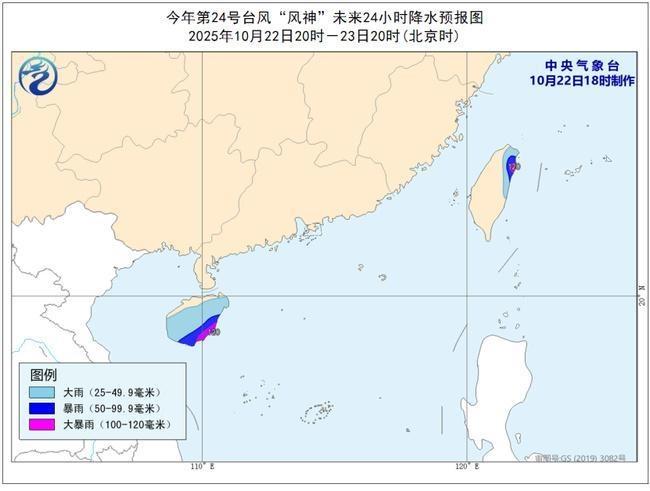 受冷空气和“风神”的共同影响,22日20时至23日20时,海南岛、台湾岛北部等地有大到暴雨,其中海南岛东南部、台湾岛北部等地部分地区有大暴雨(100—120毫米)。