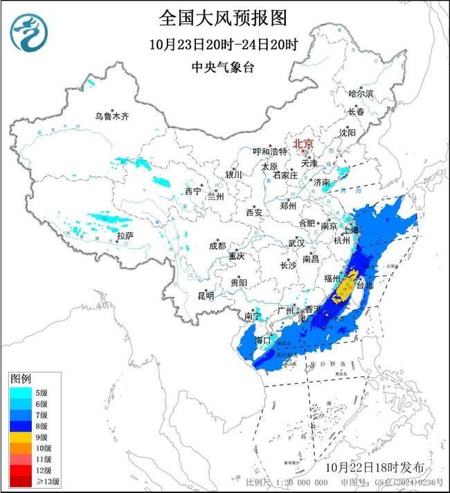 中央气象台10月22日18时继续发布台风黄色预警及大风黄色预警。预计,10月22日20时至23日20时: