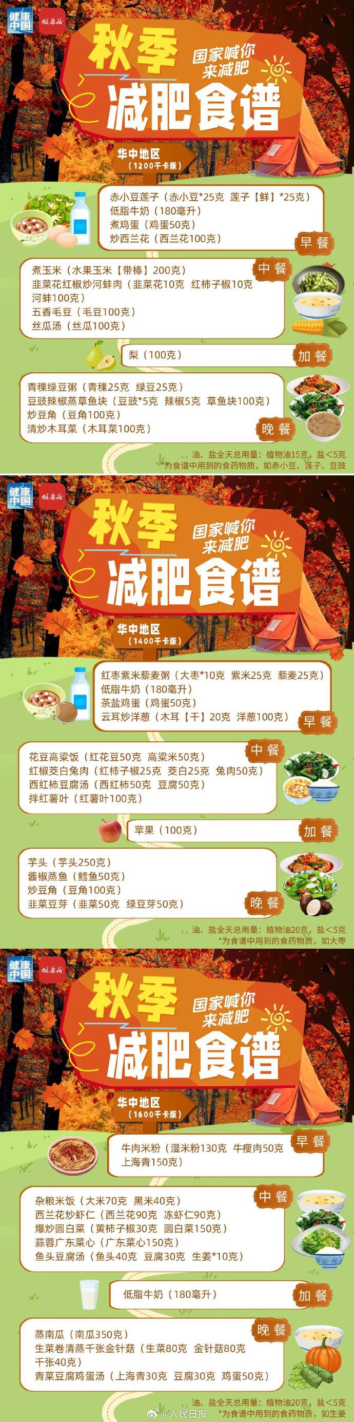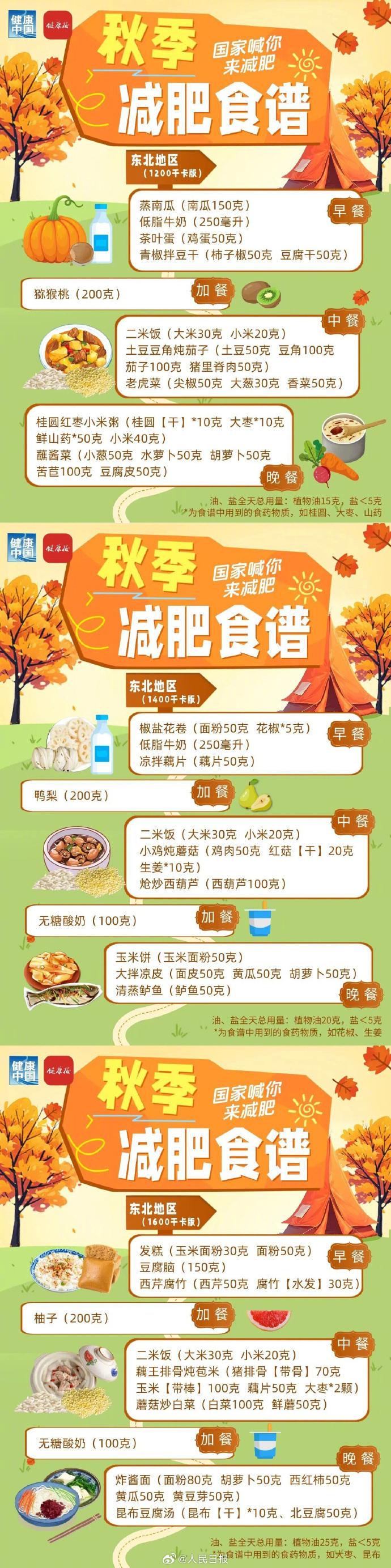 国家卫生健康委此前印发的《成人肥胖食养指南(2024版)》已在饮食方面给出权威解读。现在,又为不同地理区域的人群定制了个性化的减肥食谱,针对不同地区/季节/热量需求设计1200千卡/1400千卡/1600千卡三个等级任选,正值秋季,速速收藏食谱↓↓