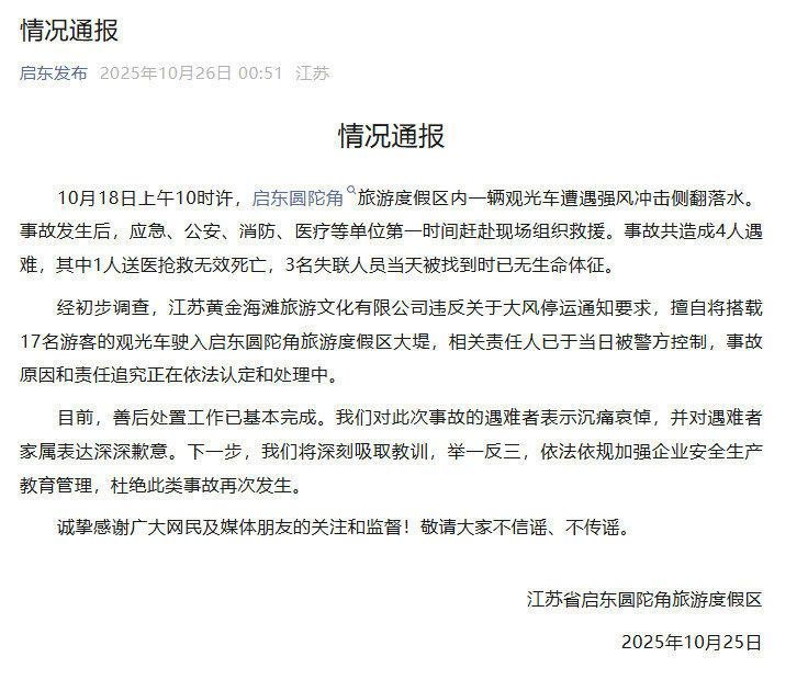 10月18日上午10时许,启东圆陀角旅游度假区内一辆观光车遭遇强风冲击侧翻落水。事故发生后,应急、公安、消防、医疗等单位赶赴现场组织救援。事故共造成4人遇难,其中1人送医抢救无效死亡,3名失联人员当天被找到时已无生命体征。