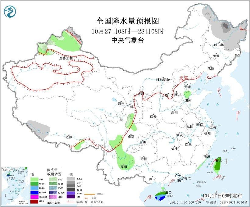 10月27日08时至28日08时,新疆北疆北部、黑龙江中东部、西藏西南部等地部分地区有小雪或雨夹雪,其中,黑龙江北部等地部分地区有中到大雪。海南岛、台湾岛大部等地部分地区有中到大雨,其中,海南岛南部等地部分地区有暴雨。黑龙江东北部部分地区有4~5级风;台湾海峡、巴士海峡将有6~8级、阵风9级的东北风,东海南部海域、台湾以东洋面、北部湾、南海北部和中西部海域将有5~7级、阵风8级的偏北到东北风。