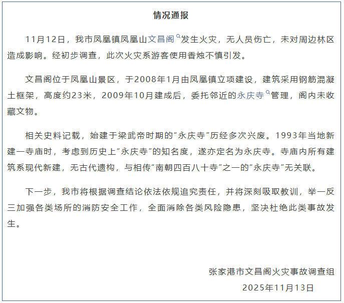 央视网消息:据“张家港发布”公众号消息,11月13日,张家港市文昌阁火灾事故调查组发布情况通报。内容如下: