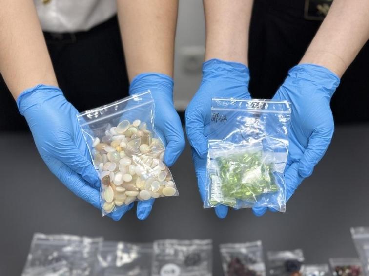 广州海关所属广州白云机场海关关员在对一架进境航班进行监管时,发现1名选择“无申报通道”通关的旅客携带的行李机检图像异常。海关关员随即进行拦截并开箱查验,在其行李中发现一批用塑料袋包装的宝石。宝石颜色和形状不一,有紫色、黄色、绿色等不同颜色,有水滴形、方形等各种形状。经送技术机构鉴定,确认上述宝石为祖母绿、红宝石、蓝宝石、欧泊、石榴石、碧玺等共计30类宝石,总数10973颗,重7.7千克。