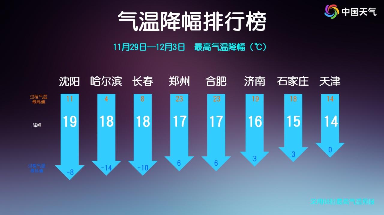 城市中像是哈尔滨、长春、沈阳,最高气温累计降幅都能达到接近20℃,哈尔滨、长春12月2日最高气温将是今冬首次降到-10℃以下,哈尔滨12月3日最低气温还将跌破-20℃。