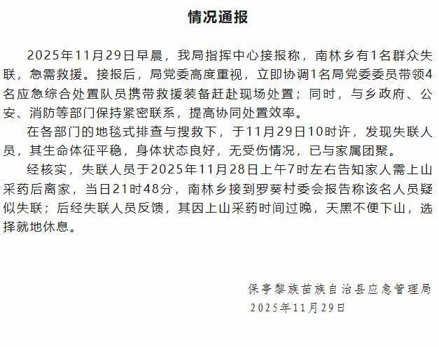经核实,失联人员于2025年11月28日上午7时左右告知家人需上山采药后离家,当日21时48分,南林乡接到罗葵村委会报告称该名人员疑似失联;后经失联人员反馈,其因上山采药时间过晚,天黑不便下山,选择就地休息。