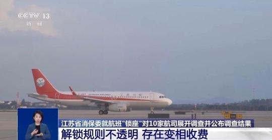 江苏省消费者权益保护委员会投诉部工作人员 张延菲:我们调查发现10家航空公司锁座范围高度集中于经济舱前排,靠窗及靠过道等消费者偏好的优质座位,仅开放中间区域,机尾等舒适度较差的座位供免费选择,限缩了消费者的选择权。