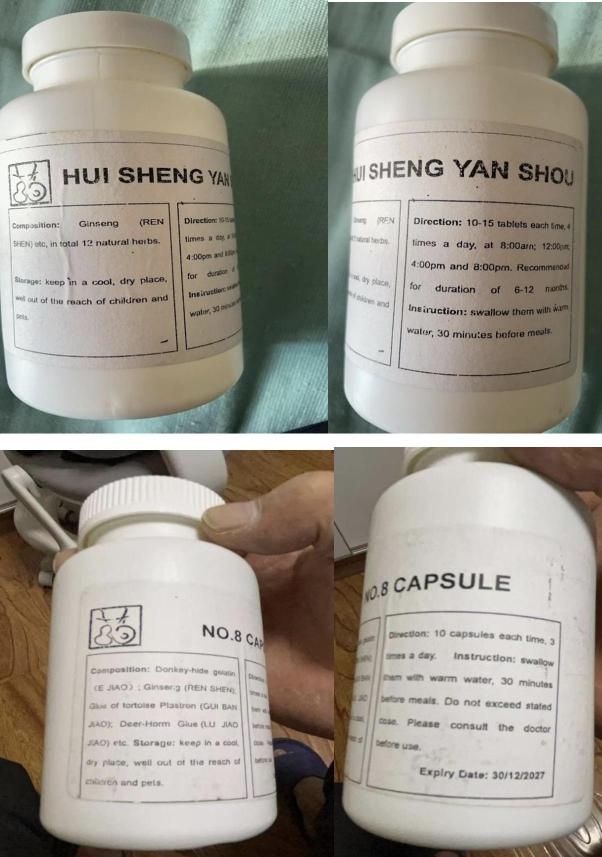 据王先生提供的照片,涉事产品“抗癌片“和“升血胶囊”均为“三无产品”,无外包装,瓶身包装也极为简易,贴有全英文成分介绍与使用说明。其中一款名为“HUI SHENG YAN SHOU”,宣称该药品由“RENSHEN(人参)等12种天然药草”。另一款名为“NO.8 CAPSULE”,其成分介绍为阿胶(E JIAO)、人参(REN SHEN)、龟板胶(GUI BAN JIAO)、鹿角胶(LU JIAO JIAO)等。