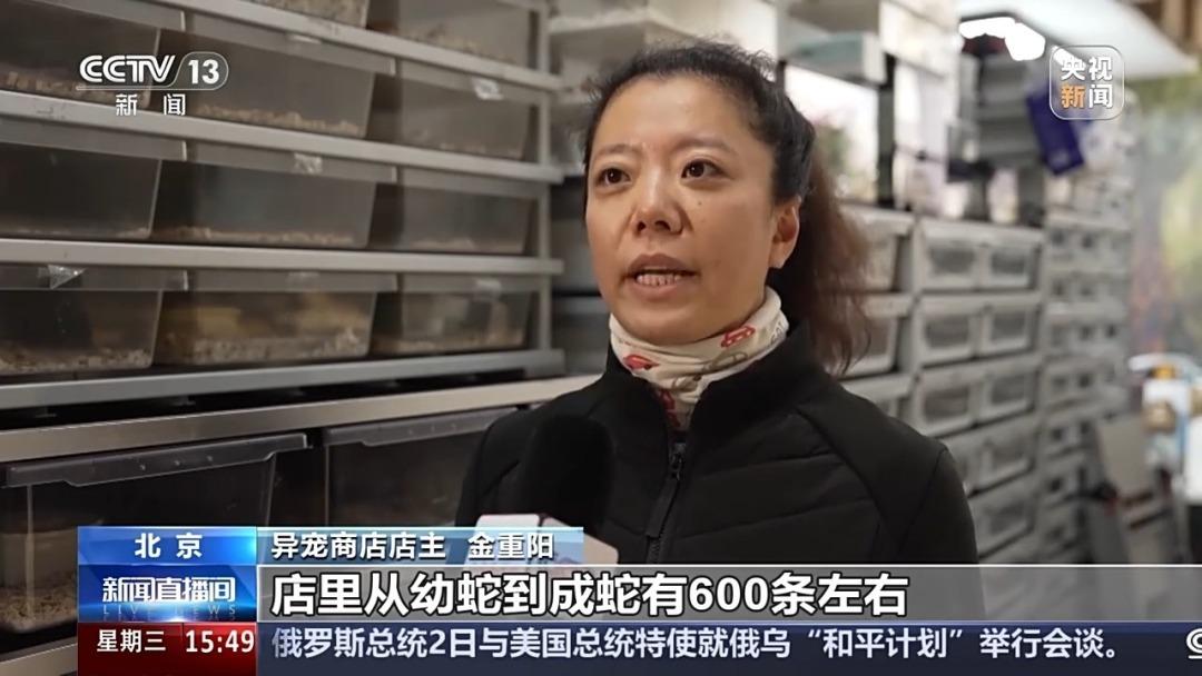 异宠商店店主 金重阳:店里从幼蛇到成蛇有600条左右,其中牛蛇体形特别大,可以长到两米七到三米左右。它需要一个更大的空间,所以大家要是想养蛇的话一定要做好心理准备,给它们一个合适的空间、合适的温度。