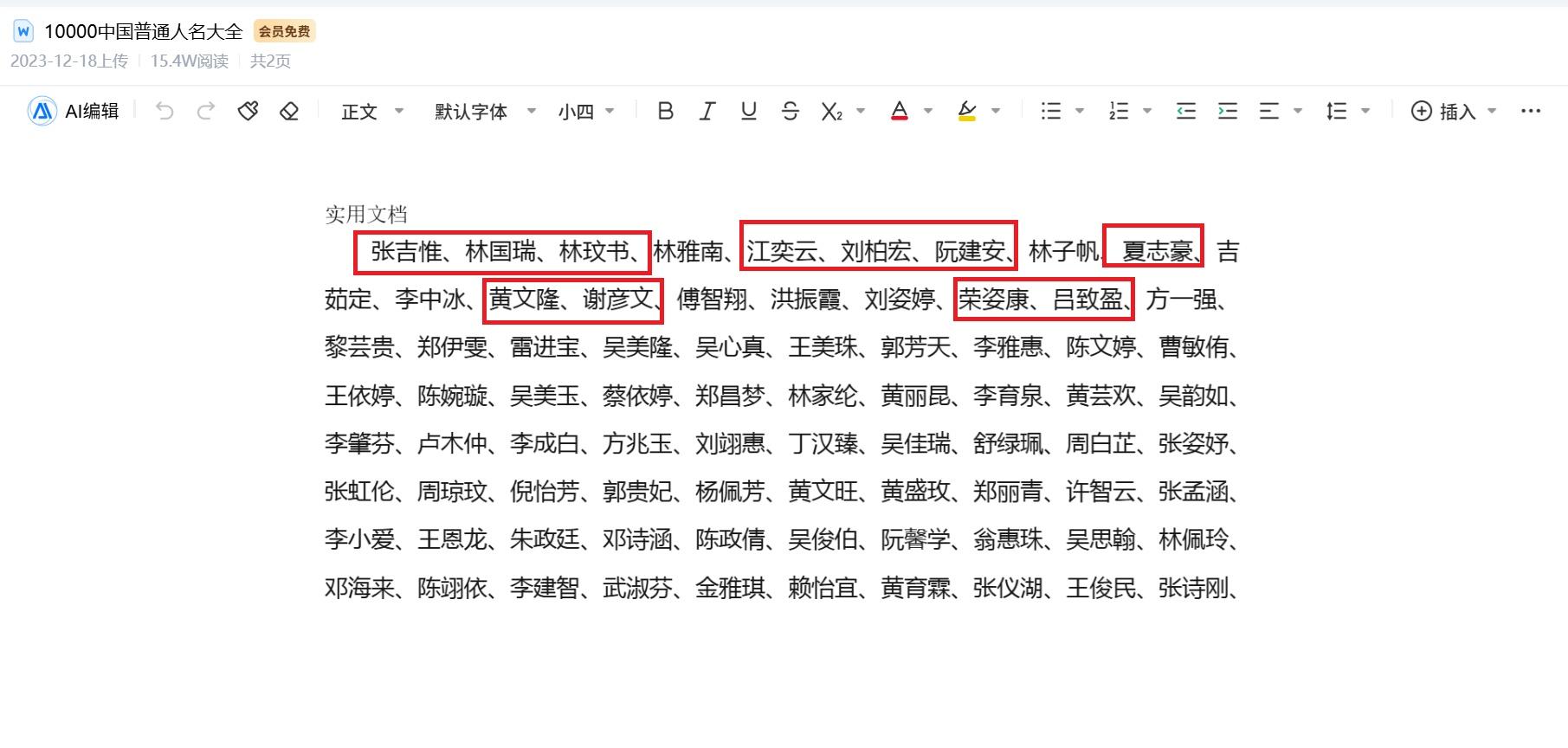 公开资料显示,《10000中国普通人名大全》中的名字如“张吉惟”、“林国瑞”等大量在网络小说中使用。
