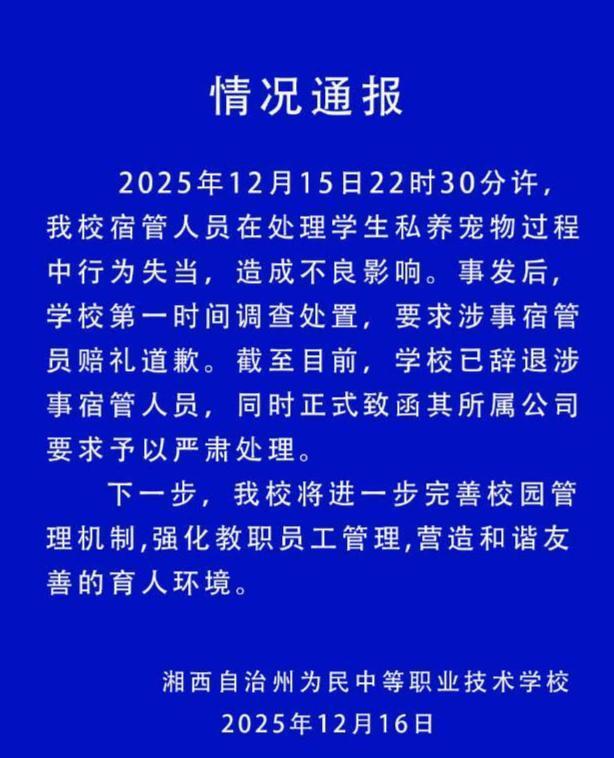16日,当事学校发布情况通报称,12月15日22时30分许,学校宿管人员在处理学生私养宠物过程中行为失当,造成不良影响。事发后,学校第一时间调查处置,要求涉事宿管员赔礼道歉。截至目前,学校已辞退涉事宿管人员,同时正式致函其所属公司要求予以严肃处理。下一步,学校将进一步完善校园管理机制,强化教职员工管理,营造和谐友善的育人环境。