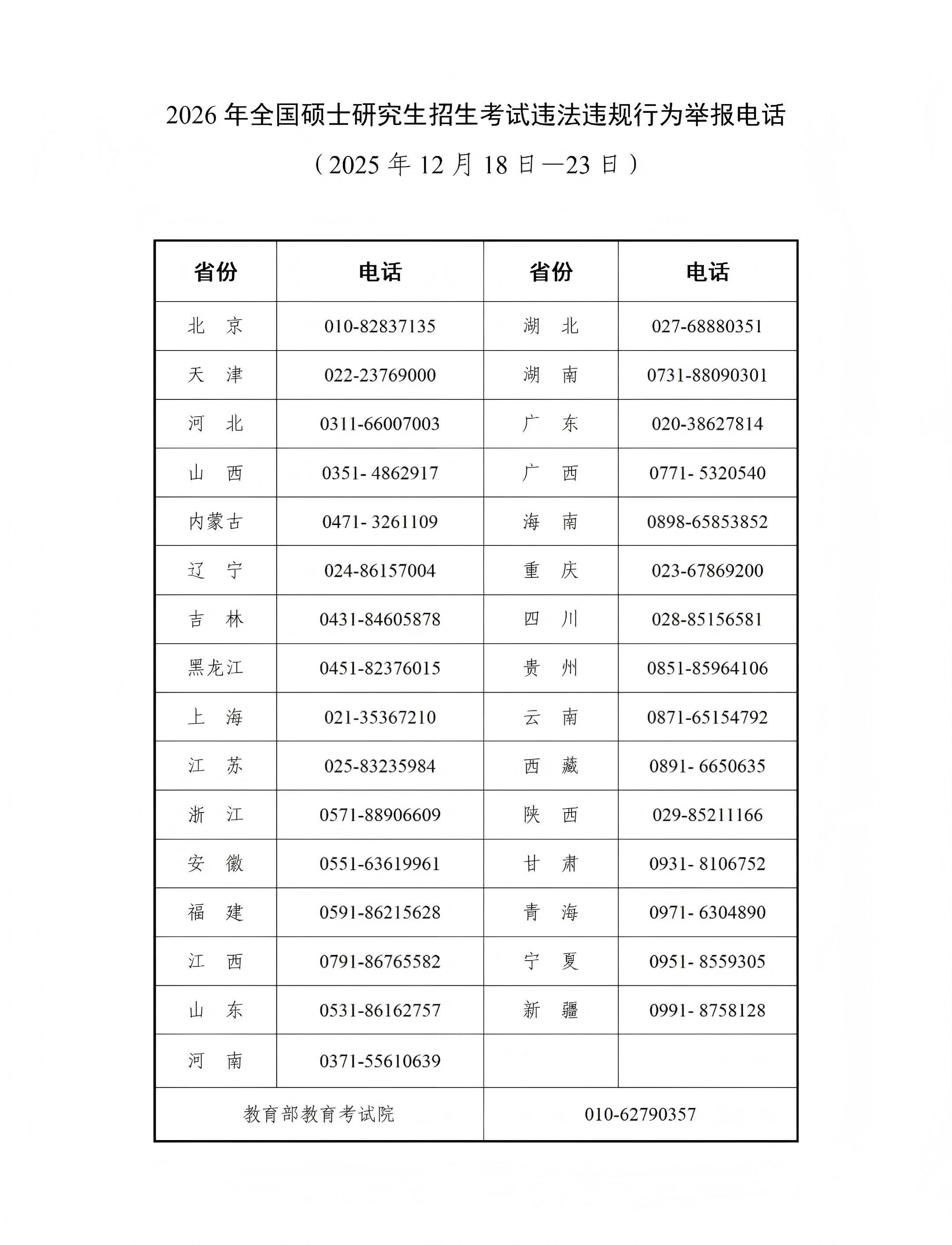 现向社会公布2026年全国硕士研究生招生考试违法违规行为举报电话,欢迎广大考生和公众参与监督。