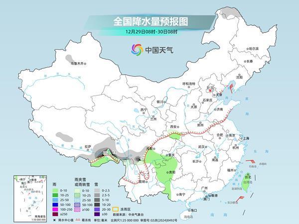 预计30日夜间开始,随着暖湿气流增强,西藏东部、四川、贵州、重庆、陕西南部、湖北西部等地降水又会发展增多。之后,水汽继续向东、向北输送,黄河以南地区将出现一轮“跨年”降水。目前来看这轮降水范围广,但强度不大,多是小到中雨雪量级。公众需密切关注临近预报,做好相关防范措施。