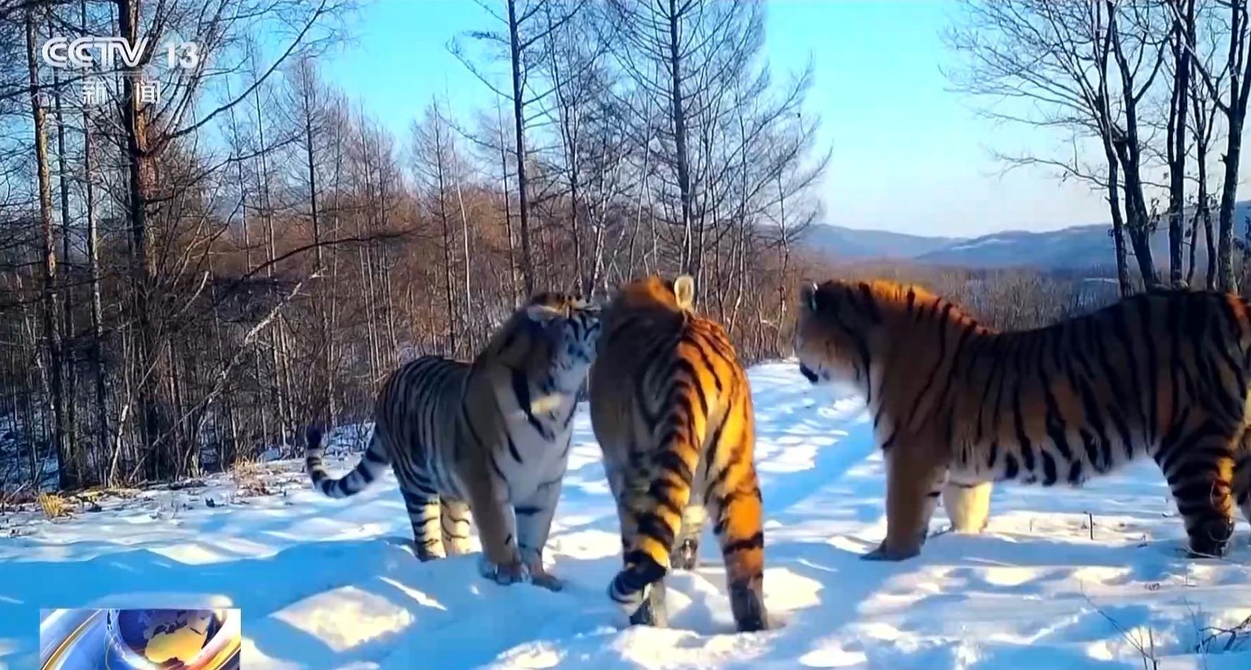 记者从东北虎豹国家公园管理局监测中心了解到,今年由预警相机拍摄到的一虎带四崽、一虎带五崽东北虎家庭活动的地点之间,直线距离约为5公里,仅隔着几道山岭,且都在村屯的附近。