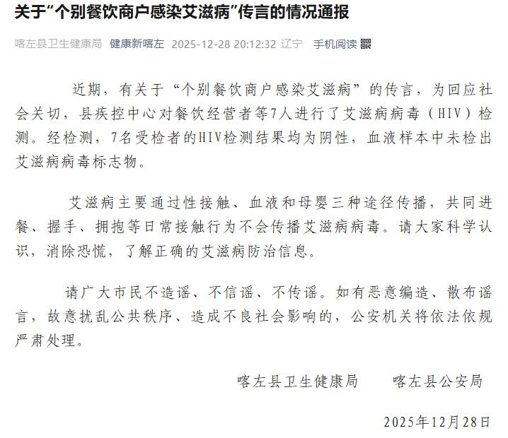 12月28日,辽宁喀左县卫生健康局和公安局发布情况通报,回应“个别餐饮商户感染艾滋病”传闻: