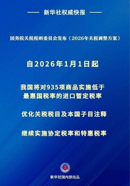 国务院关税税则委员会12月29日对外发布《2026年关税调整方案》,将自2026年1月1日起实。