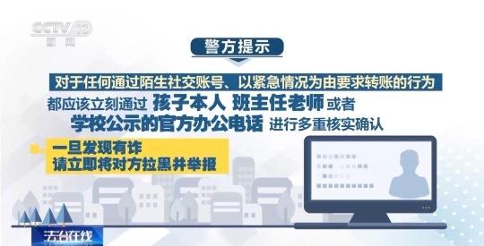 同时对于任何通过陌生社交账号、以紧急情况为由要求转账的行为,都应该立刻通过孩子本人、班主任老师或者学校公示的官方办公电话进行多重核实确认,一旦发现有诈,请立即将对方拉黑并举报。