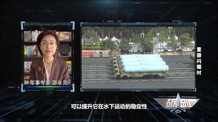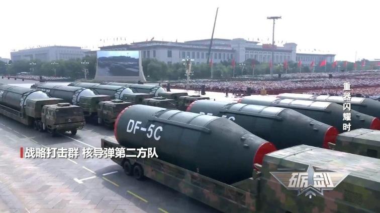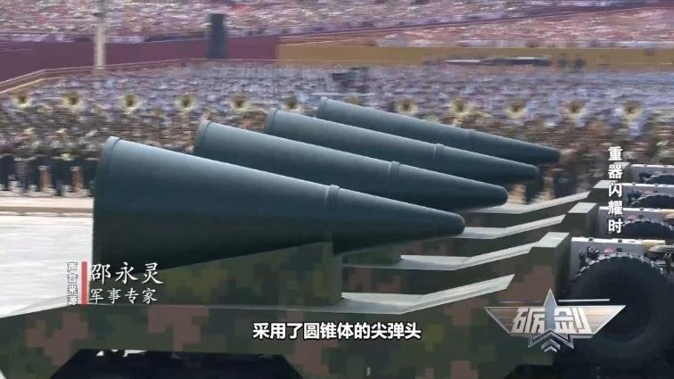 军事专家 邵永灵:东风-5C是一款液体燃料洲际弹道导弹,在阅兵式上使用了三辆车拖运,采用了圆锥体的尖弹头。