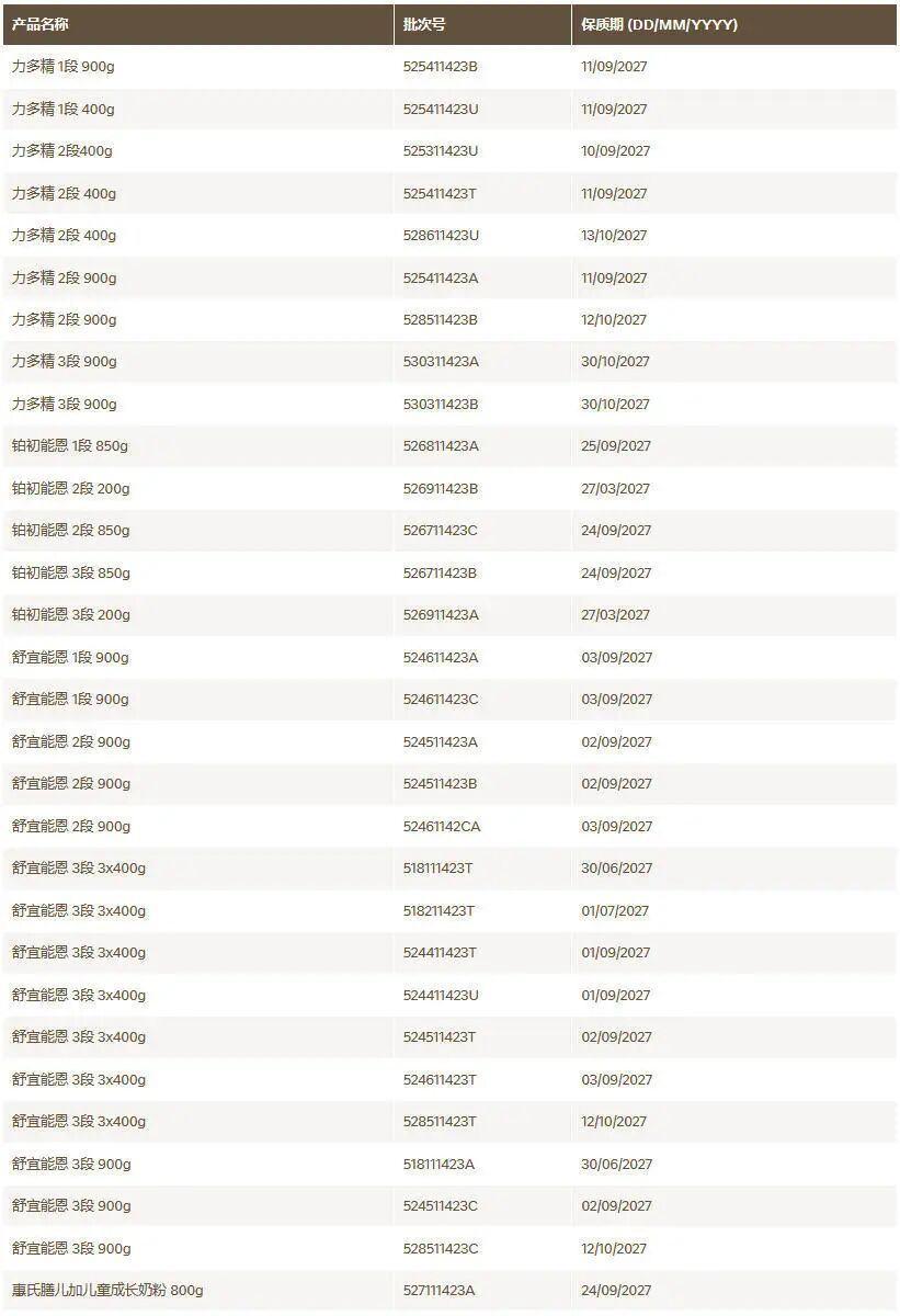 雀巢中国官网发布的“预防性自愿回收婴幼儿配方奶粉”公告披露了需要召回的产品批次,涉及力多精、铂初能恩、舒宜能恩、惠氏等多批次产品。公告称,自愿回收所有此次涉事的进口自欧洲、在中国大陆跨境电商渠道销售的婴幼儿配方奶粉。本次回收范围之外的所有其他雀巢产品及同类产品的其他批次均可安全食用。