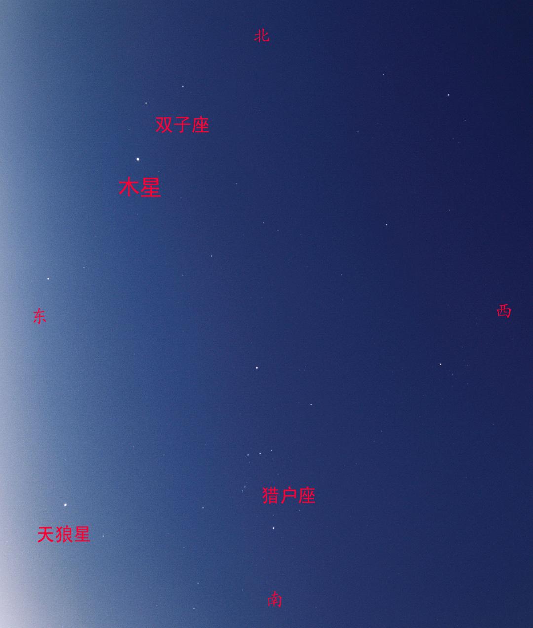 近日夜幕降临后,怎样寻找木星?天文爱好者告诉记者,近期木星在双子座的星空“逆行”。木星与双子座的“北河二”和“北河三”相距很近。在木星的南面,可找到夜空最明亮的恒星“天狼星”和猎户座的“东斗三星”。