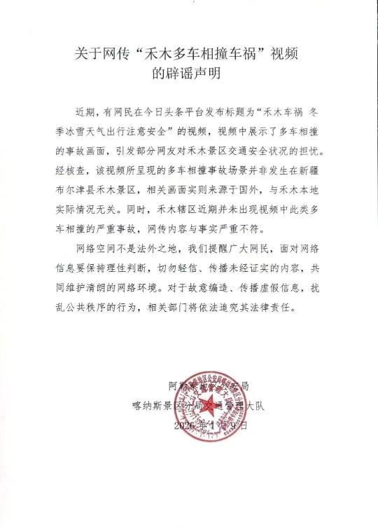 经与相关部门核实,该视频内容不实,禾木喀纳斯景区未发生此类多车相撞的严重事故,网传内容与事实严重不符,属于网络谣言。