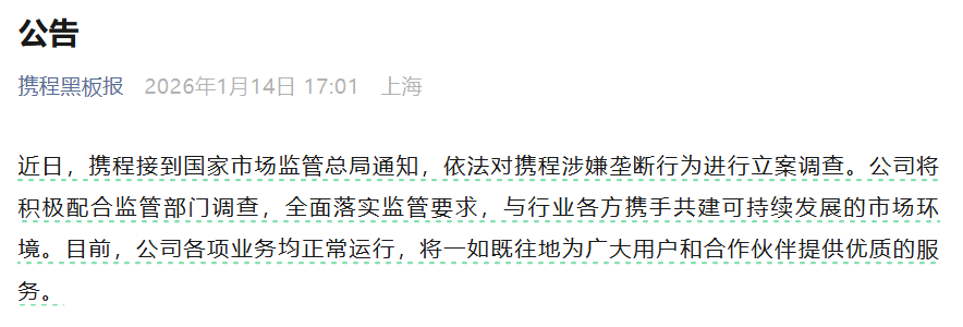 近日,携程接到国家市场监管总局通知,依法对携程涉嫌垄断行为进行立案调查。公司将积极配合监管部门调查,全面落实监管要求,与行业各方携手共建可持续发展的市场环境。目前,公司各项业务均正常运行,将一如既往地为广大用户和合作伙伴提供优质的服务。