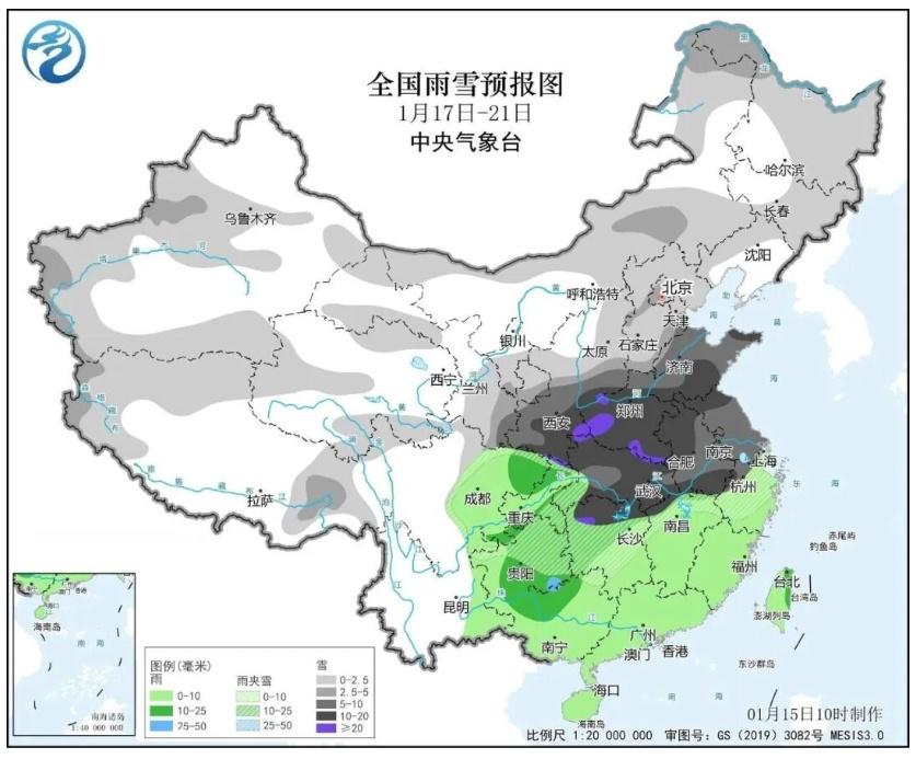 中央气象台预计,17日至21日,西北地区东部、华北南部、黄淮、江汉、江淮西部、江南北部等地有中到大雪或雨夹雪,陕西南部、山西南部、河南、山东西部和半岛地区、湖北中西部、湖南北部、安徽等地部分地区有暴雪;上述地区新增积雪深度3~8厘米,陕西南部、河南西部、湖北西北部等地部分地区10厘米左右,局地可达15厘米以上;主要降雪时段为19日至20日。19日至21日,河南西部、湖北西部、湖南、贵州、重庆东部等地部分地区有冻雨。