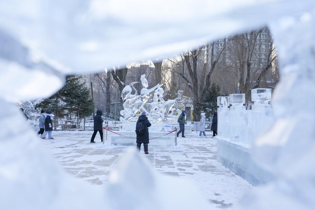人们在哈尔滨市兆麟公园举办的第52届哈尔滨冰灯艺术游园会上参观(1月14日摄)。新华社记者 王松 摄