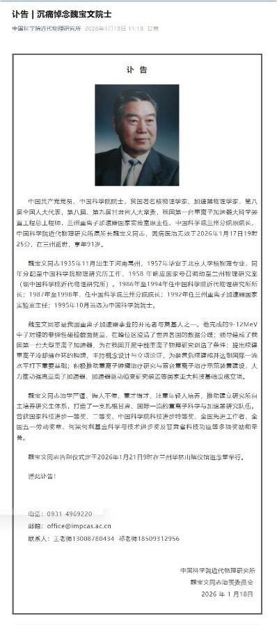 中新网1月18日电 1月18日,中国科学院近代物理研究所在其官方微信公众号上发布讣告称,中国科学院院士、著名核物理学家魏宝文去世,享年91岁。全文如下: