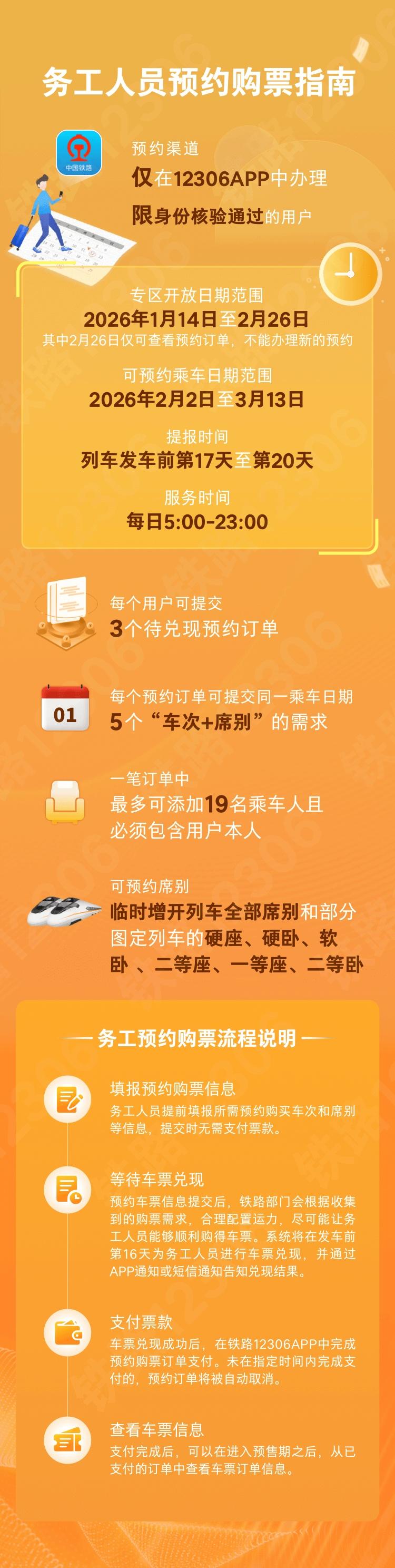 日前,铁路12306手机客户端务工人员预约购票服务上线,符合条件的务工人员可通过专区预约购买2026年春运期间往返车票,将有力保障重点群体旅客春运出行。