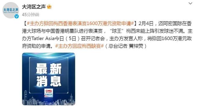 2月4日,迈阿密国际在香港大球场与中国香港明星队进行表演赛,“球王”梅西未能上阵引发球迷不满。主办方Tatler Asia今日(5日)召开记者会,主办方发言人称,将撤回1600万港元政府资助的申请。