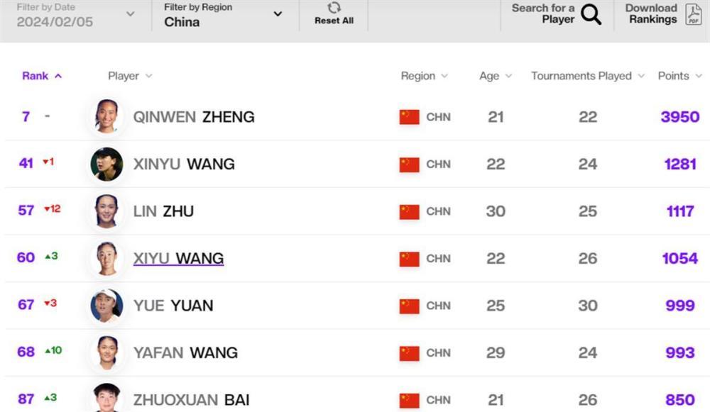 2月6日,WTA公布了本周世界排名,郑钦文稳坐世界第7位,王雅繁则延续着近来的好状态,排名提升了10位来到第68位,她也是本周Top100的中国选手中排名增速最快的。
