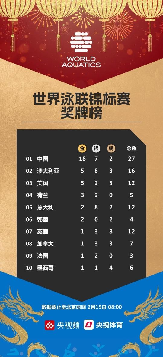 世界泳联锦标赛第14比赛日奖牌榜发布:中国队18金7银2铜领跑。