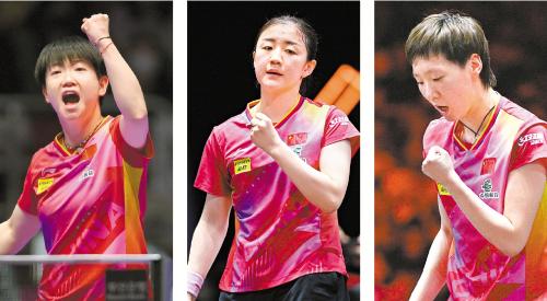 孙颖莎、陈梦、王曼昱(从左到右)竞争奥运席位占先机。(新华社)