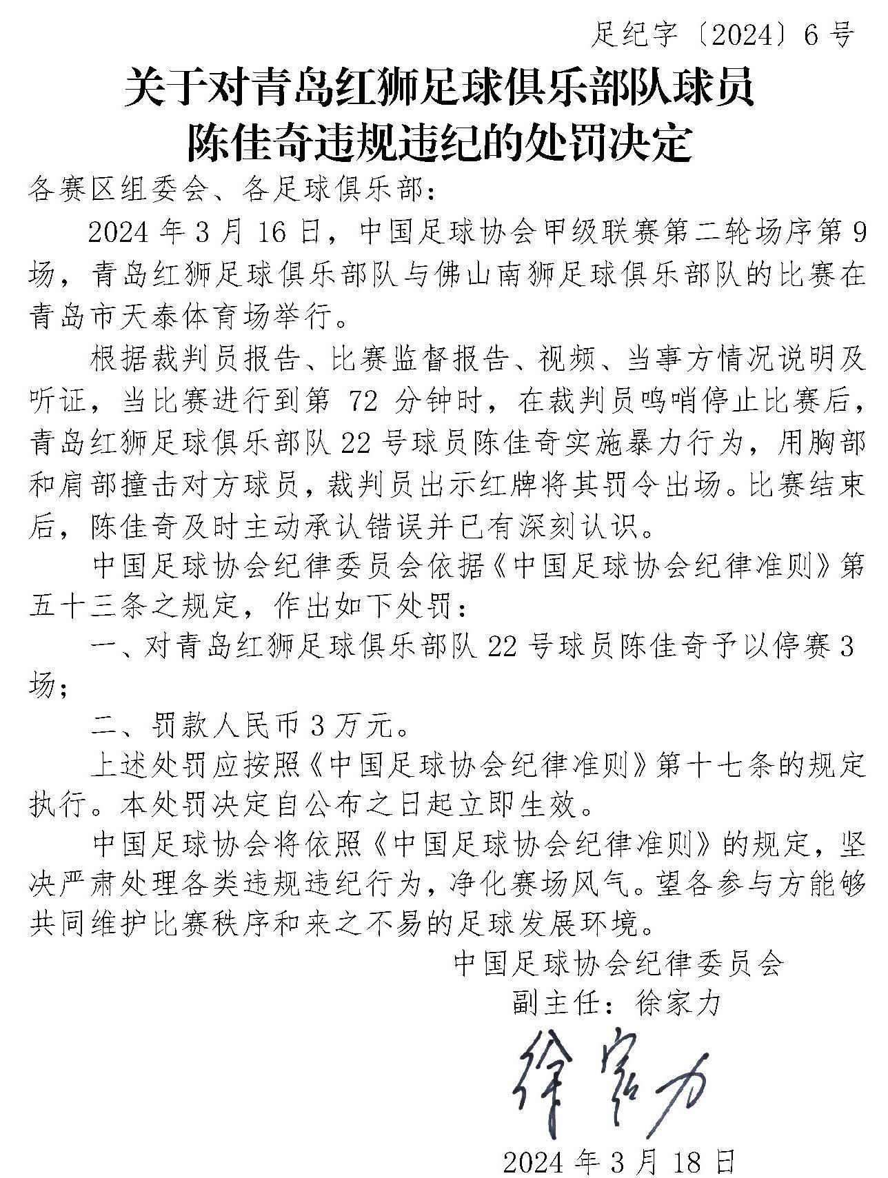 关于对青岛红狮足球俱乐部队球员陈佳奇违规违纪的处罚决定