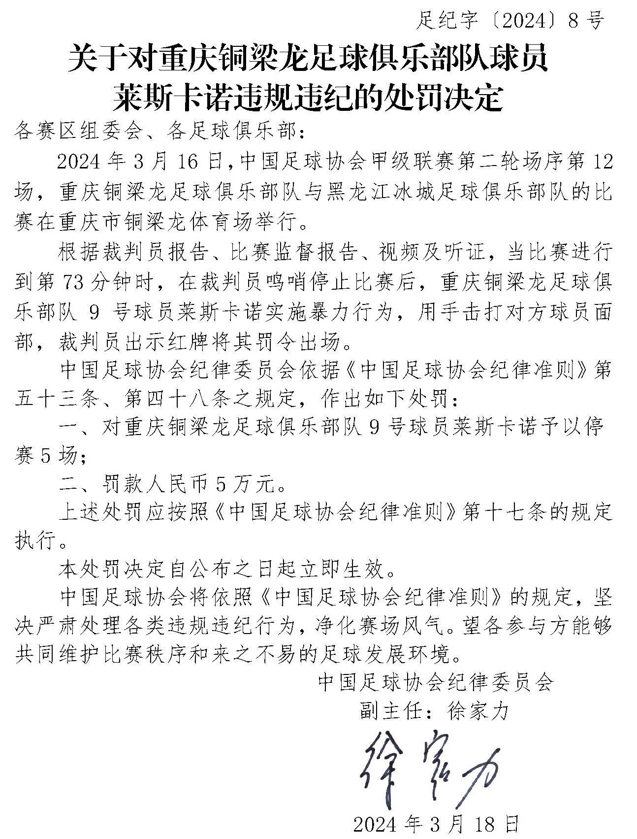 关于对重庆铜梁龙足球俱乐部队球员莱斯卡诺违规违纪的处罚决定