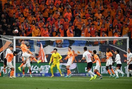3月9日,北京国安队球员马马杜·特拉奥雷(上)在比赛中争顶。新华社记者 朱峥 摄