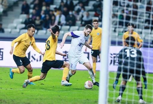 3月8日,长春亚泰队球员元敏诚(前右)在比赛中带球突破。新华社记者 李紫恒 摄