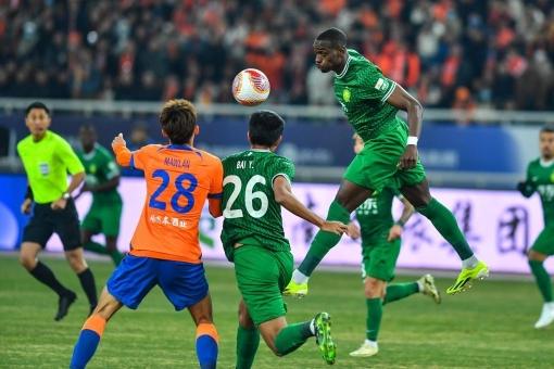 3月8日,青岛海牛队与长春亚泰队双方球员在比赛中拼抢。新华社记者 李紫恒 摄