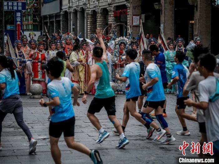 4月27日,中外跑友在广西梧州竞逐半程马拉松,沿途近距离观看梧州粤剧、狮舞表演。2024梧州半程马拉松组委会供图