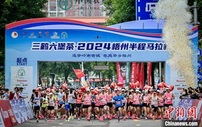 中新社梧州4月28日电 2024梧州半程马拉松27日鸣枪开跑。来自中国、英国、美国、法国、日本、埃塞俄比亚等国家的近2万名跑友齐聚岭南古城——广西梧州,竞逐半程马拉松。